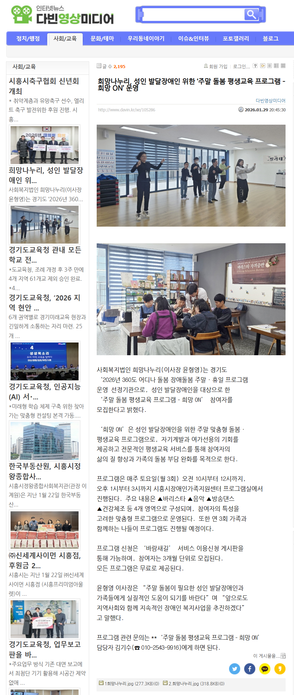 Èñ¸Á³ª´©¸®, ¼ºÀÎ ¹ß´ÞÀå¾ÖÀÎ À§ÇÑ ¡®ÁÖ¸» µ¹º½ Æò»ý±³À° ÇÁ·Î±×·¥ – Èñ¸Á ON¡¯ ¿î¿µ