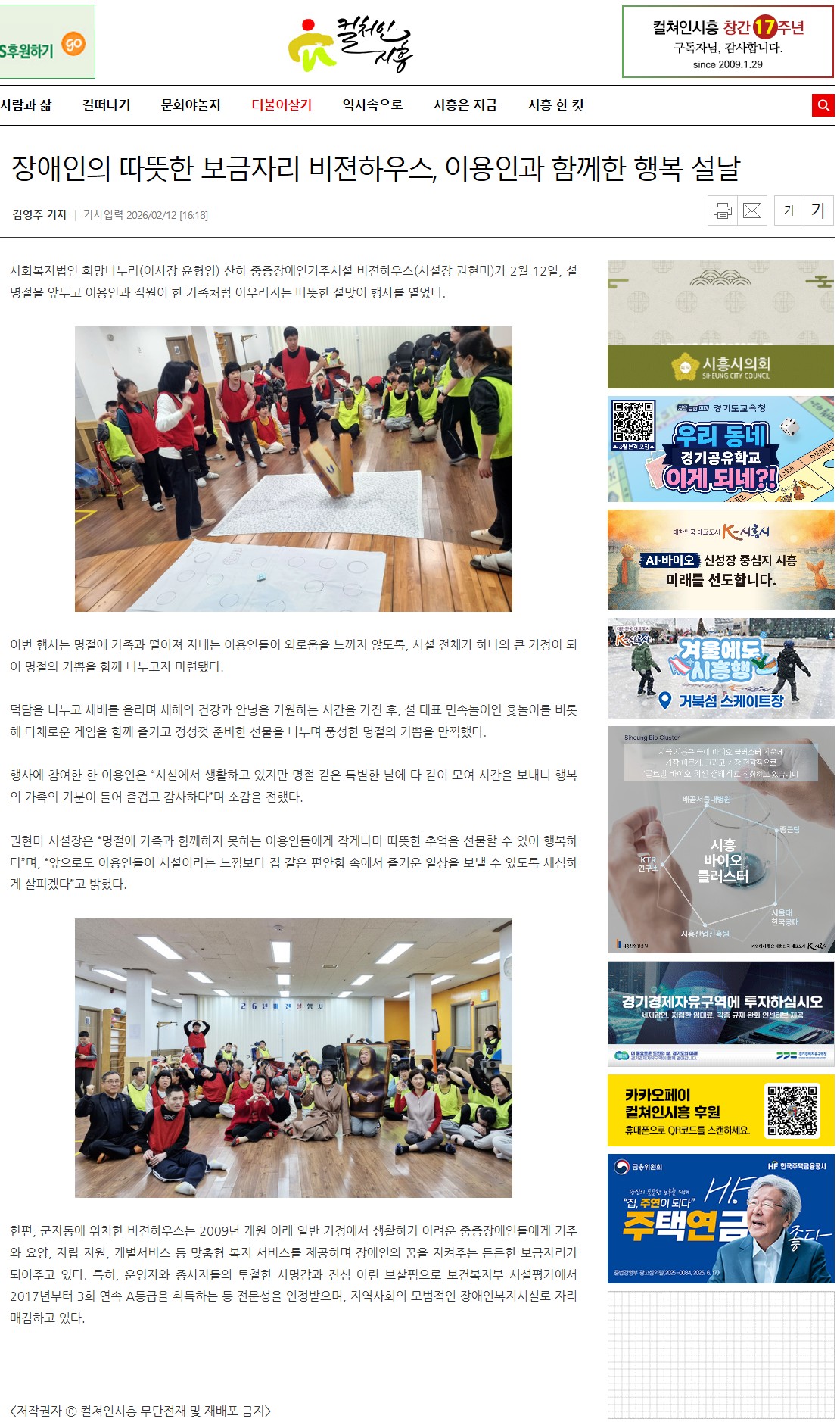 ºñÁ¯ÇϿ콺¿¡¼ Áö³ 2¿ù 12ÀÏ, ÀÌ¿ëÀΰú Á÷¿øÀÌ ÇÑ °¡Á·Ã³·³ ¾î¿ì·¯Áö´Â '26³â ºñÁ¯¼³¸ÂÀÌ Çà»ç¸¦ÁøÇàÇÏ¿´½À´Ï´Ù. ¾ð·ÐÀ» ÅëÇØ °ü·Ã ¼Ò½Ä ÀüÇØµå¸³´Ï´Ù.