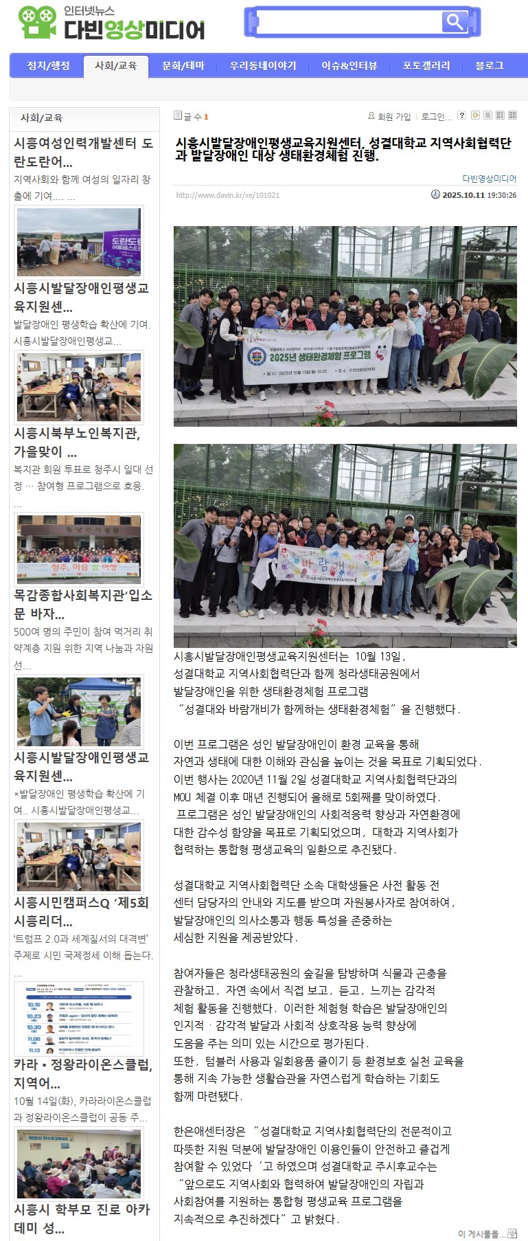 »çȸº¹Áö¹ýÀÎ Èñ¸Á³ª´©¸®ÀÇ »êÇϱâ°ü ½ÃÈï½Ã¹ß´ÞÀå¾ÖÀÎÆò»ý±³À°Áö¿ø¼¾ÅÍ¿¡¼ ¼º°á´ëÇб³ Áö¿ª»çȸÇù·Â´Ü°ú Áö³ 13ÀÏ, û¶ó»ýŰø¿ø¿¡¼ ¹ß´ÞÀå¾ÖÀÎ ´ë»ó »ýÅÂȯ°æÃ¼ÇèÀ» ÁøÇàÇÏ¿´½À´Ï´Ù. ¾ð·ÐÀ» ÅëÇØ °ü·Ã ¼Ò½Ä ÀüÇØµå¸³´Ï´Ù.