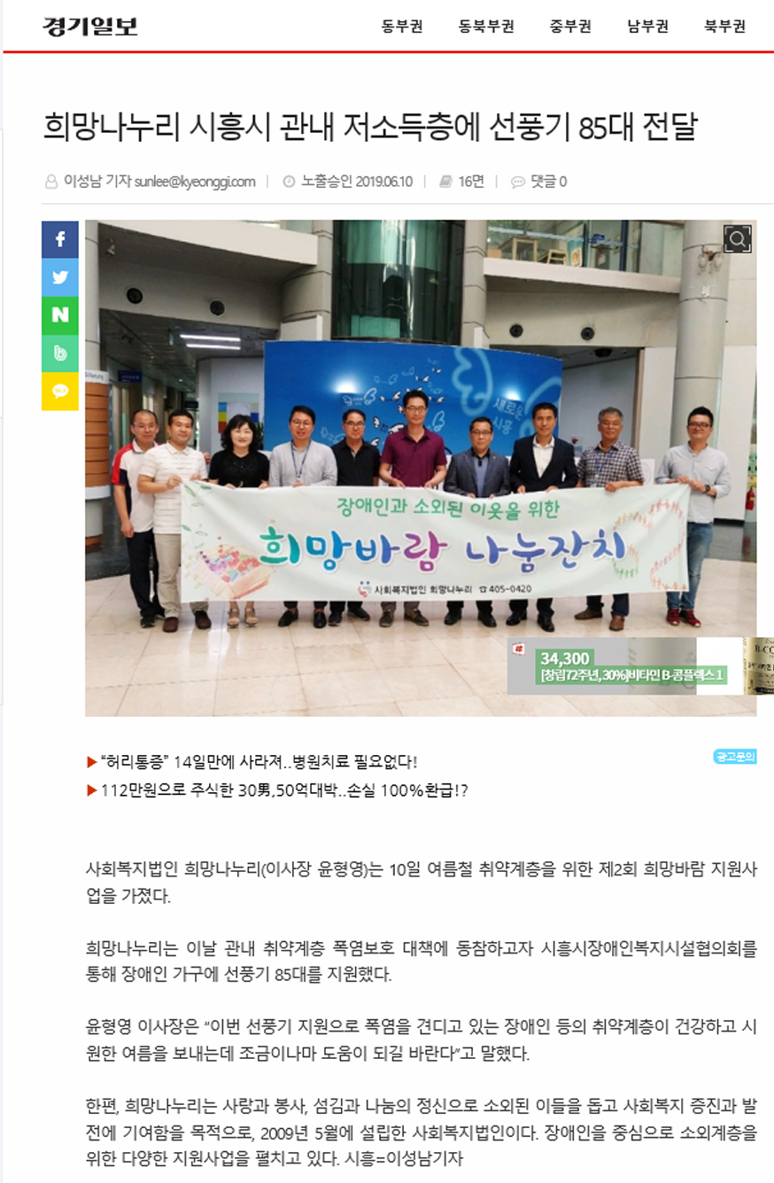 [°æ±âÀϺ¸] Èñ¸Á³ª´©¸® ½ÃÈï½Ã °ü³» Àú¼ÒµæÃþ¿¡ ¼±Ç³±â 85´ë Àü´Þ