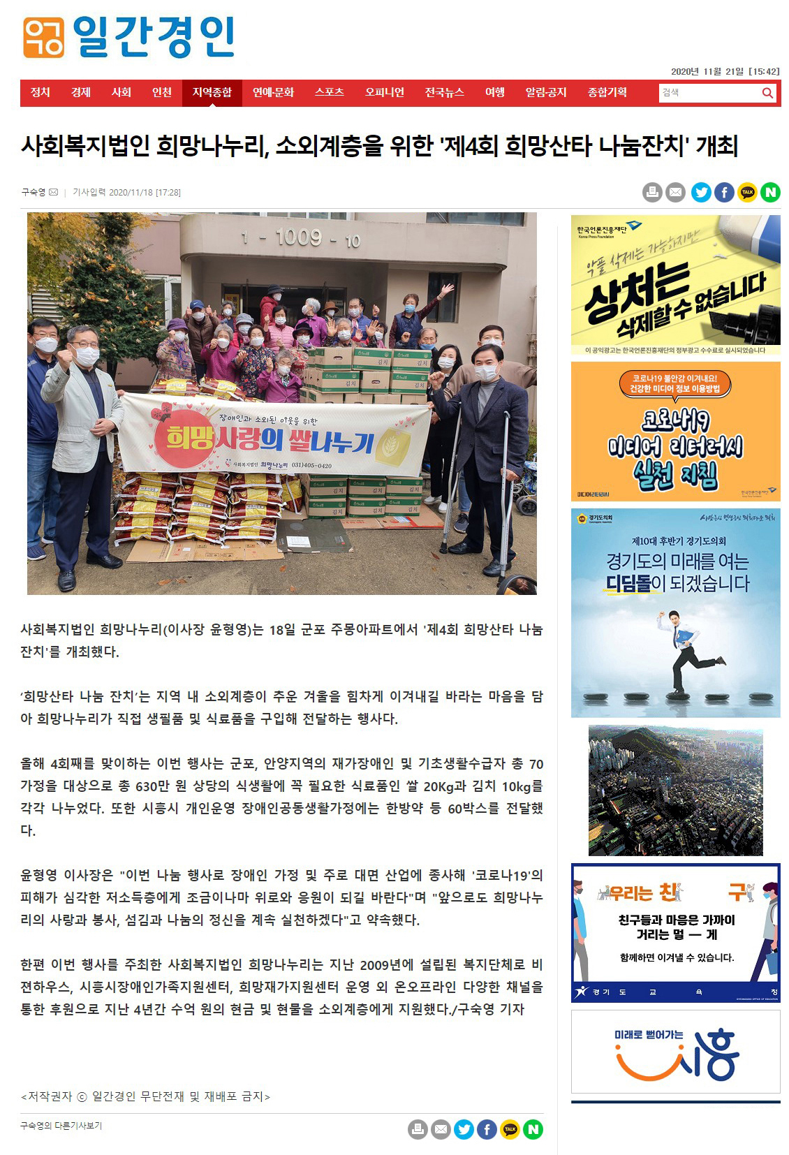 »çȸº¹Áö¹ýÀÎ Èñ¸Á³ª´©¸®, ¼Ò¿Ü°èÃþÀ» À§ÇØ 'Á¦4ȸ Èñ¸Á»êŸ ³ª´®ÀÜÄ¡' °³ÃÖ